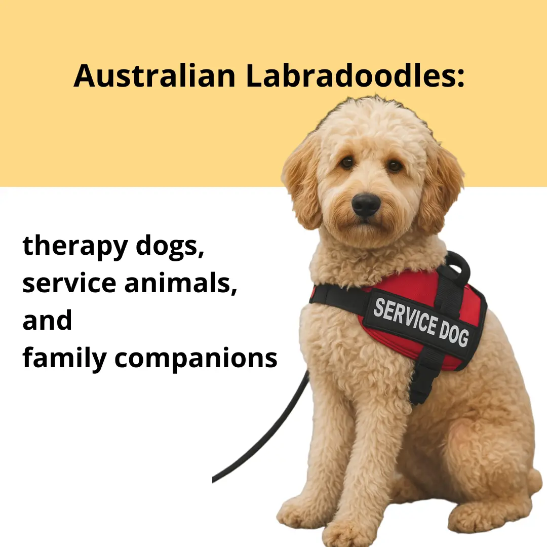 Their medium size makes them easier to handle than larger breeds, while their low-shedding coat suits families or individuals with allergies. These traits make Australian Labradoodles a practical choice for people seeking a trained service dog or assistance animal.
