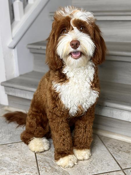 Coco is a miniature-sized Labradoodle with a vibrant red coat and an equally vibrant personality.